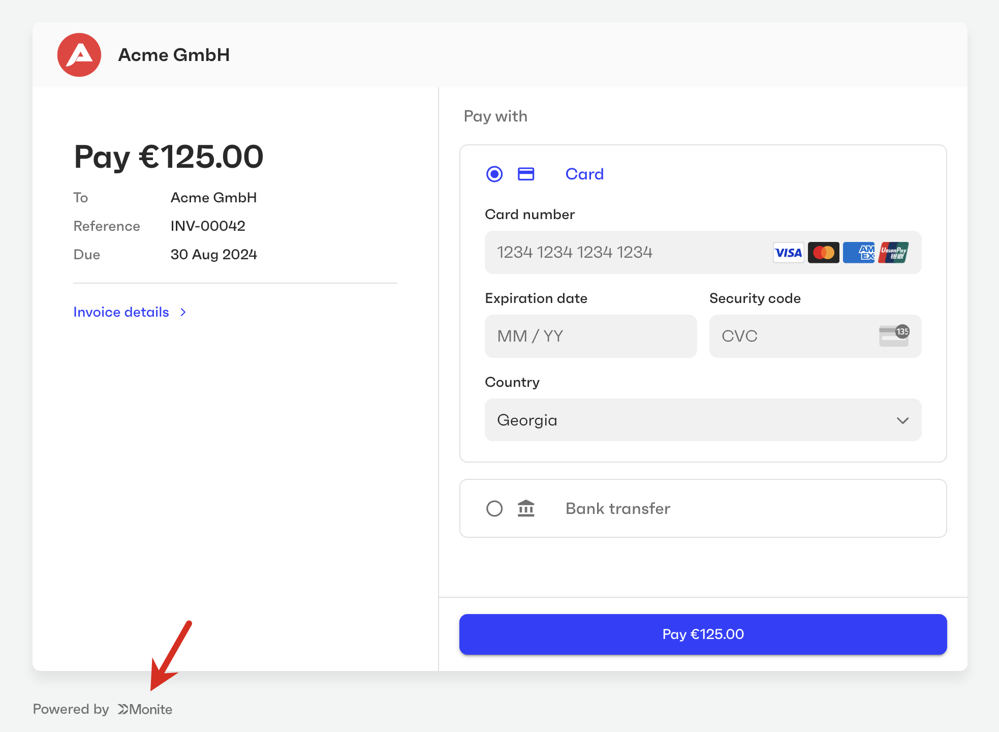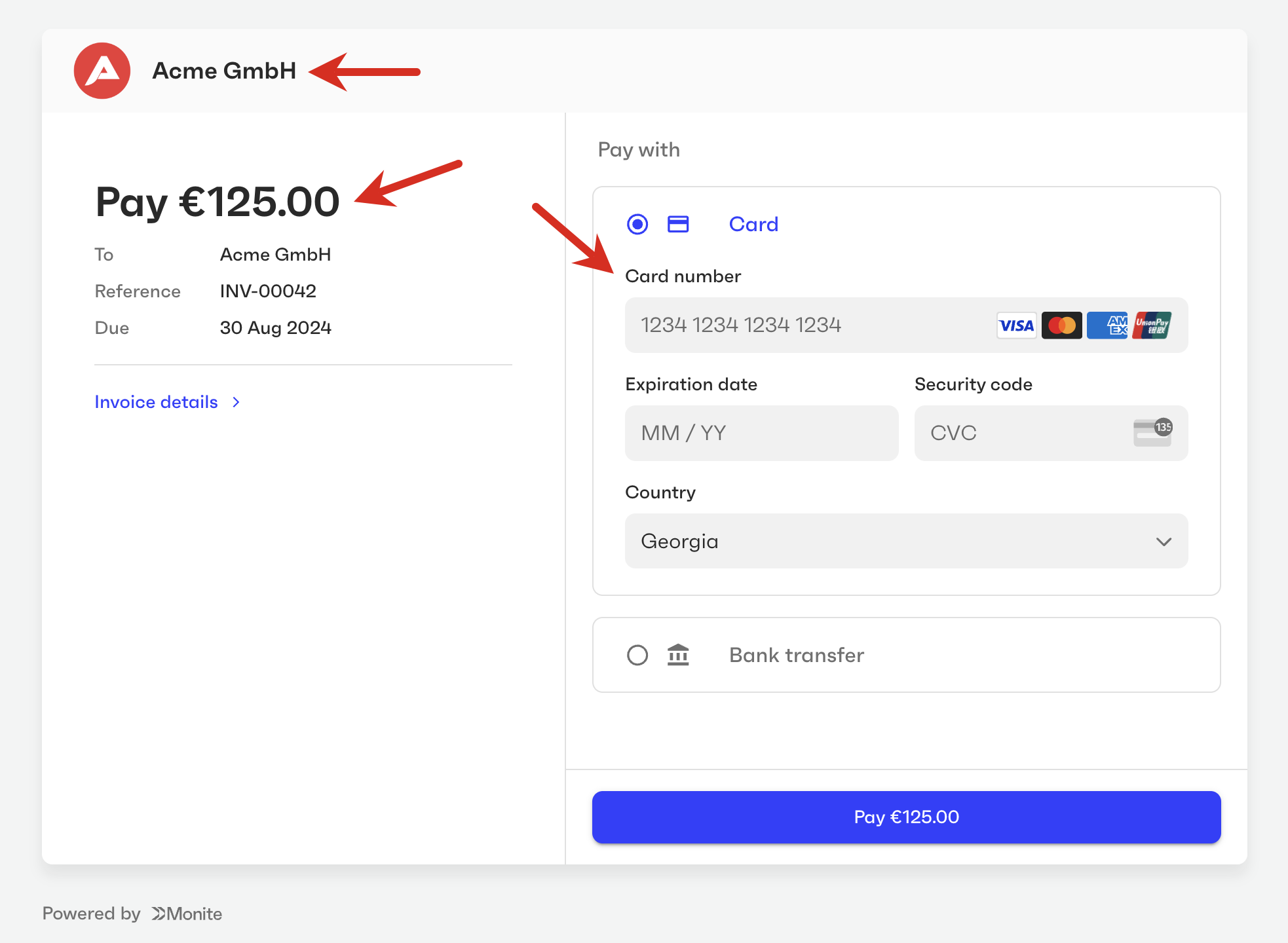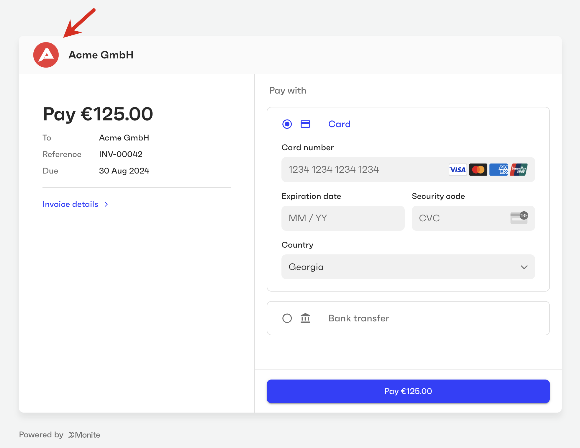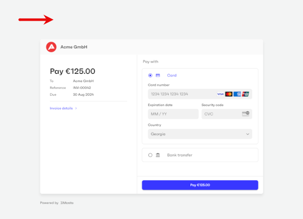 You can customize the user interface elements of Monite-hosted payment pages to fit your brand guidelines and make the payers feel that they are on your own platform.