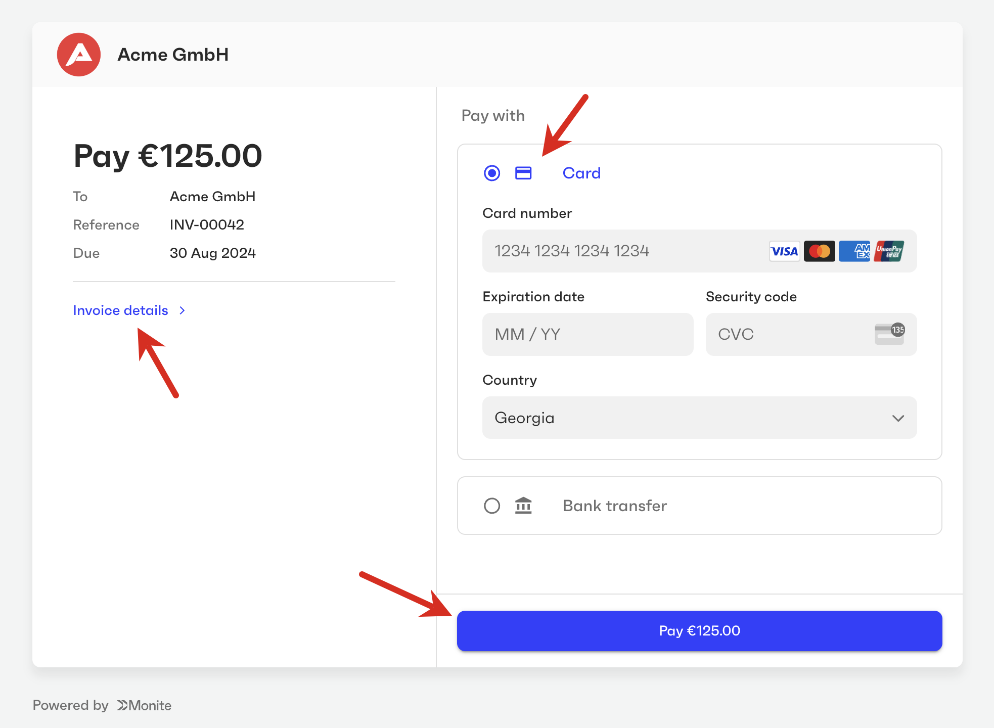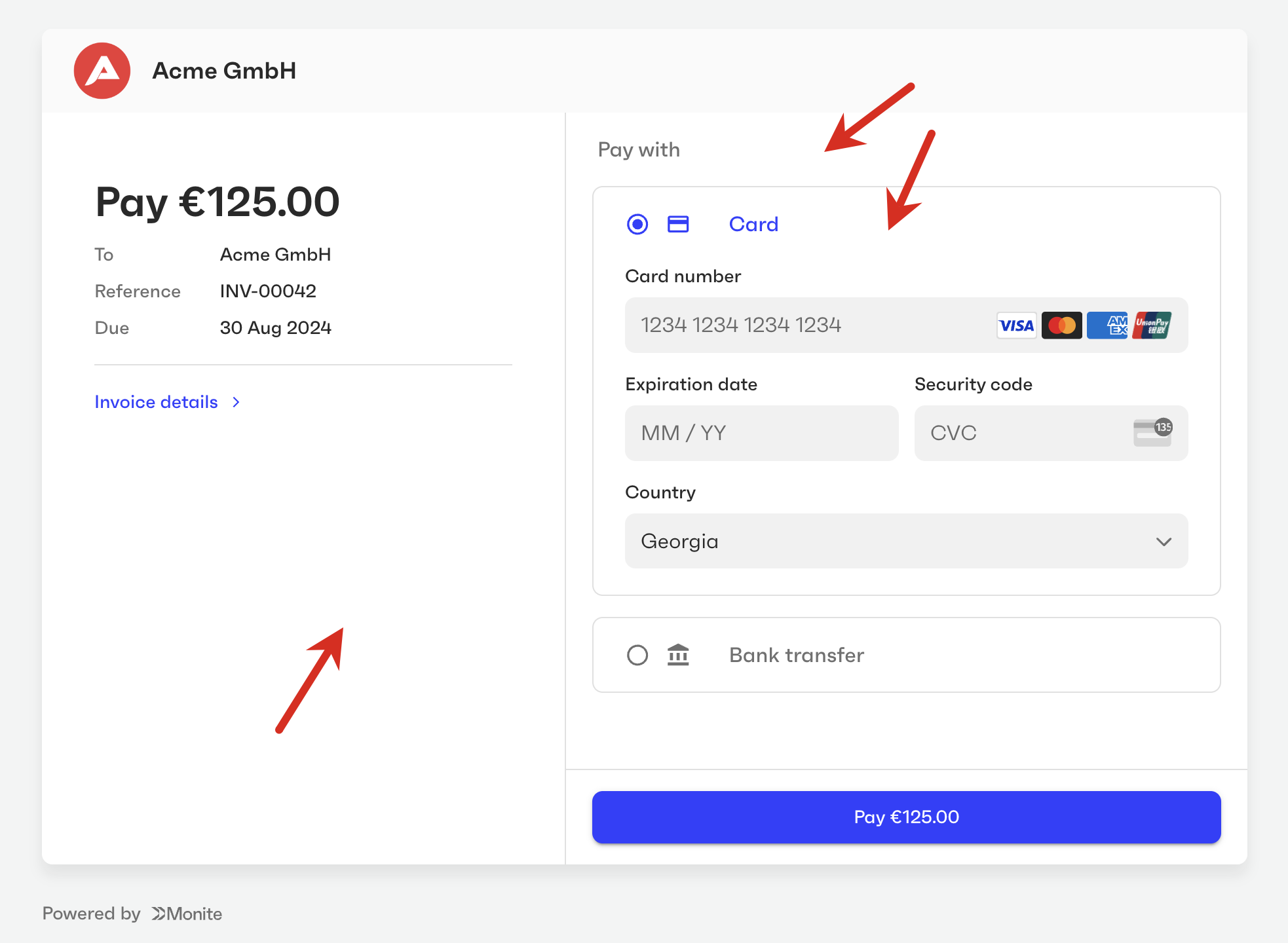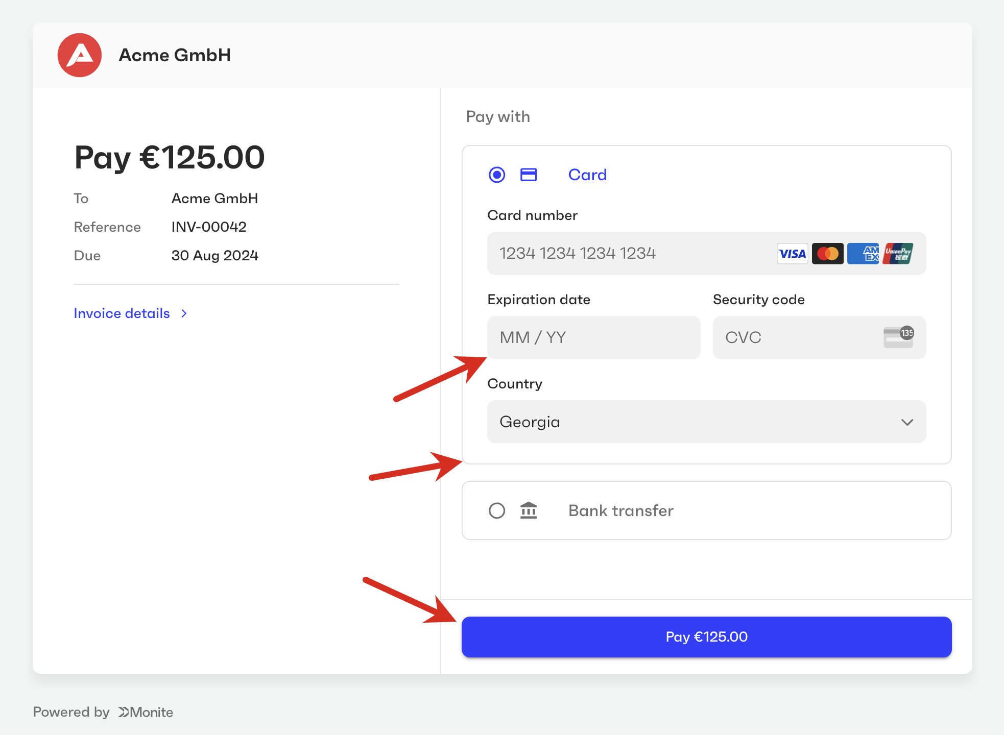 You can customize the user interface elements of Monite-hosted payment pages to fit your brand guidelines and make the payers feel that they are on your own platform.