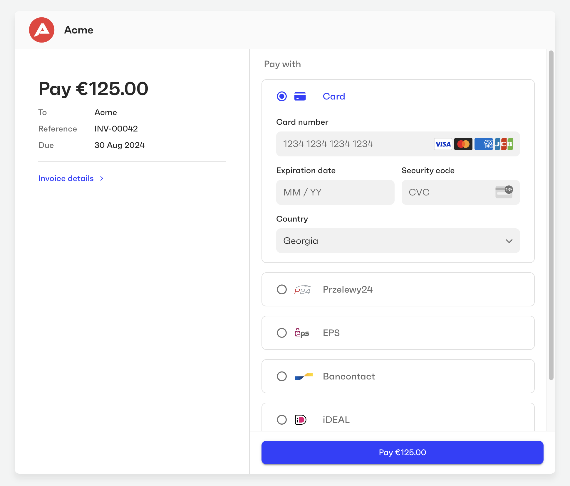 ) with the payer. When a payer navigates to this URL, they will see the payment page displaying information about the invoice and payment amount. The payer can select their preferred payment method and enter their payment information to initialize the payment.